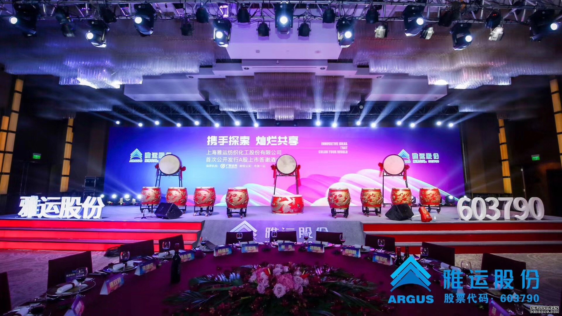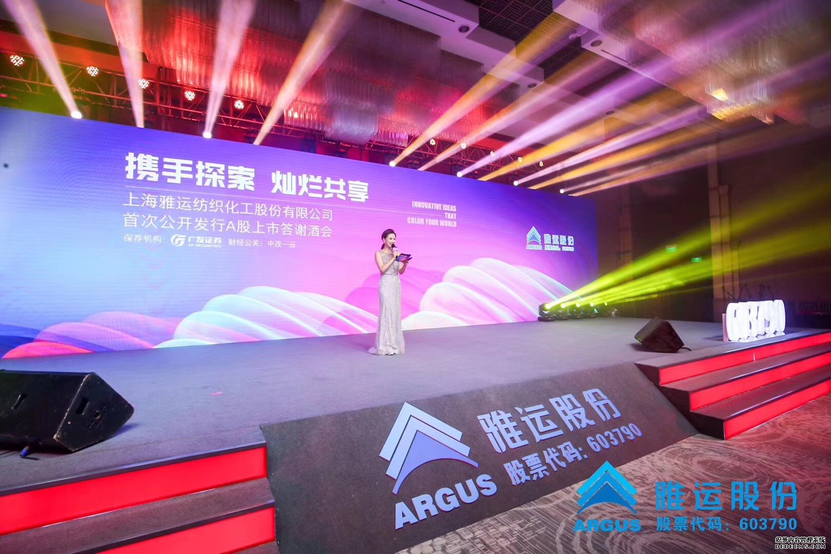 上海雅運紡織化工股份有限公司,成立于1999年8月11日,是一家專業致力于紡織化工產品的研發、生產加工、市場推廣以及提供技術服務的高新科技企業。 2018年9月11號正式上市登錄A股,‘攜手探索,燦爛共享’就是本次答謝酒會的主題,在這個歷史性的時刻,上海天茨廣告也祝福雅運股份紅紅火火。